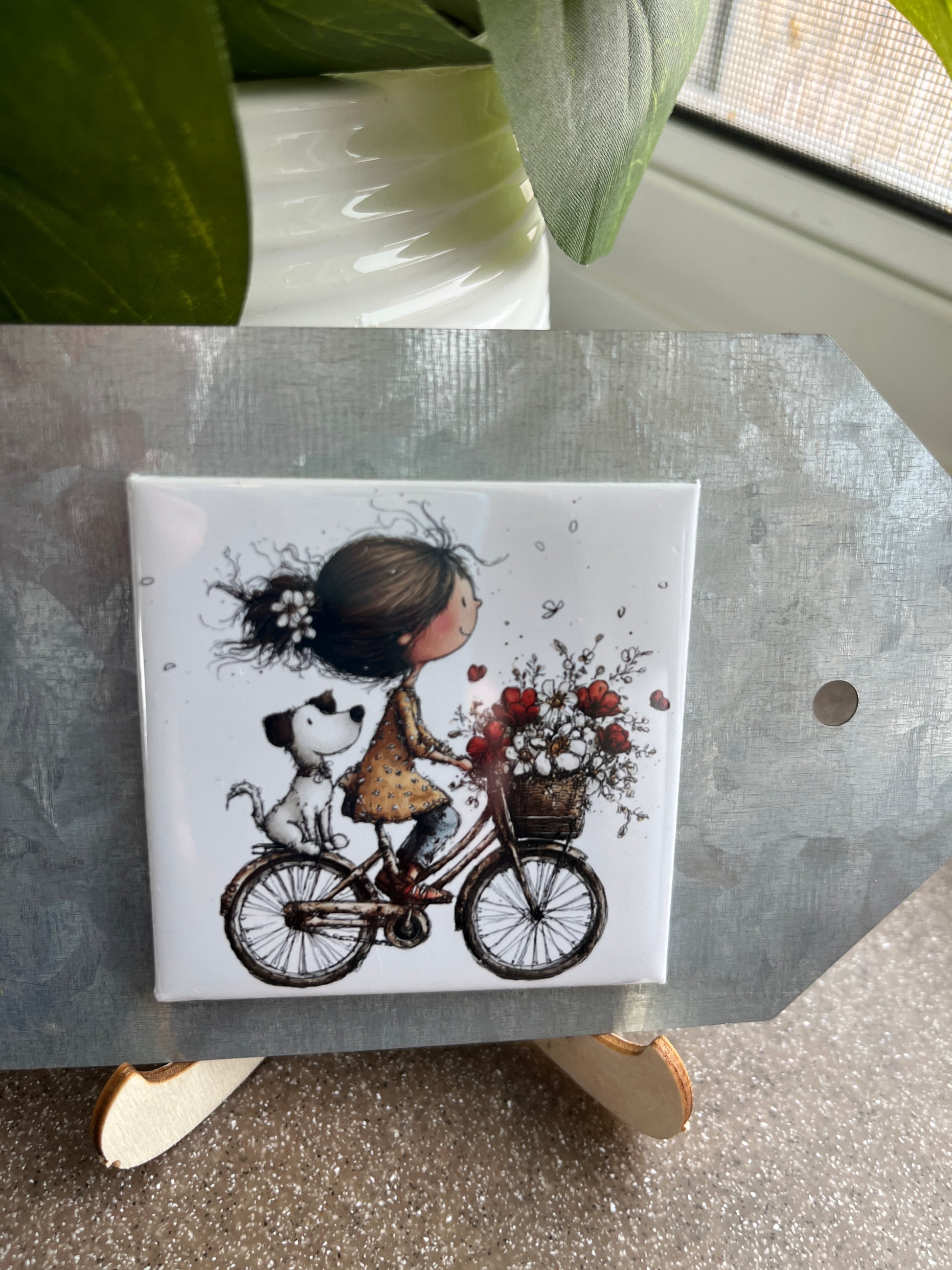 Girl and dog on a bike 2.5" square magnet.