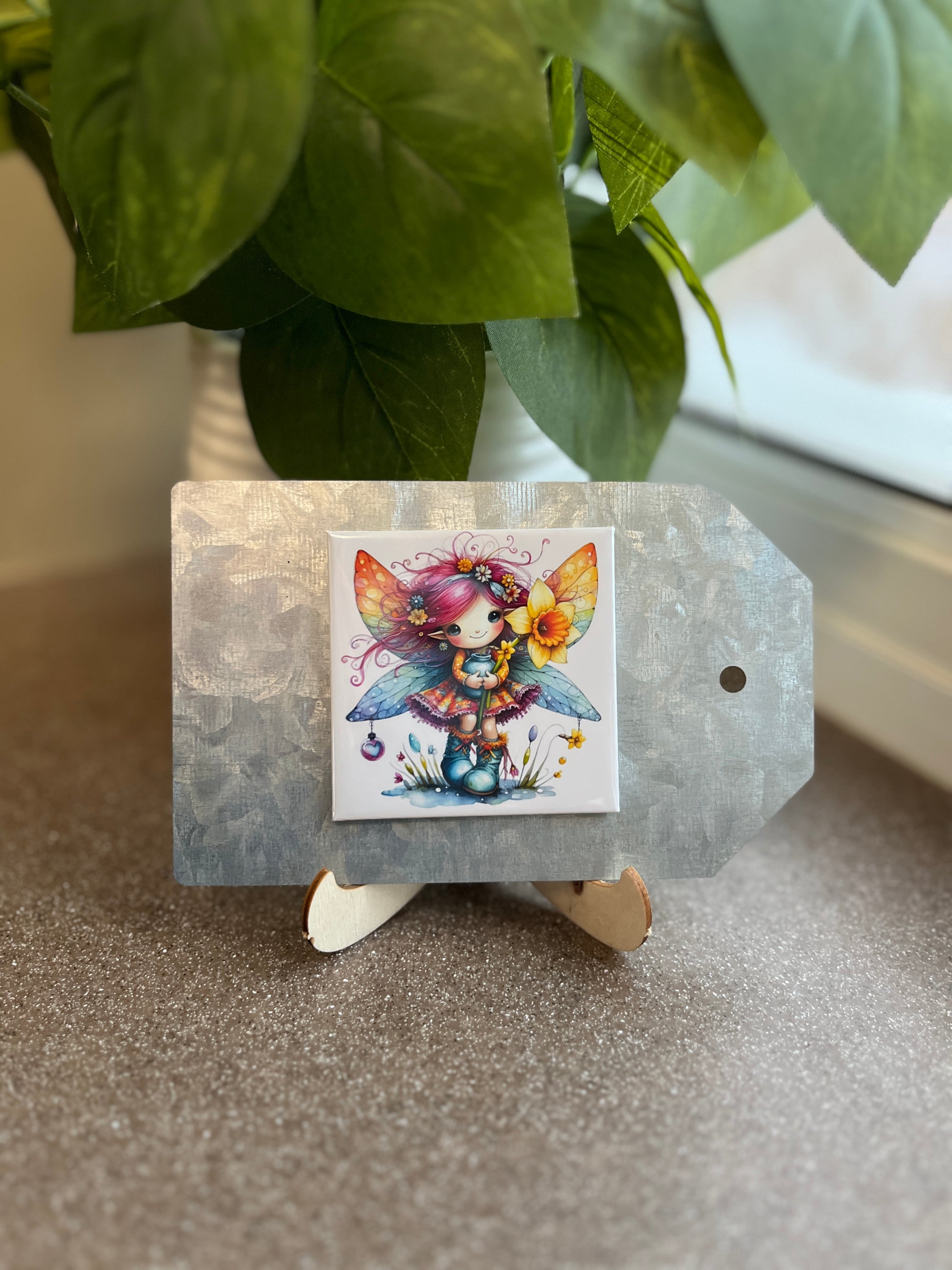 Spring Fairy with Yellow Flower 2.5" square magnet.